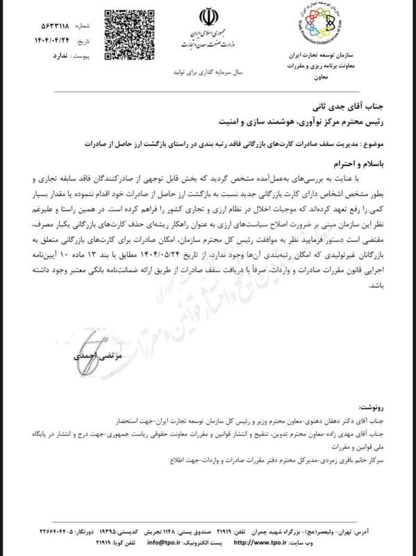 سازمان توسعه تجارت در بخشنامه ای اعلام کرد: امكان صادرات براي كارتهاي بازرگاني متعلق به بازرگانان غير توليدي كه امكان رتبه بندي آنها وجود ندارد از تاريخ ١٤٠٤/٠٥/٢٤ مطابق با بند ١٣ ماده ١٠ آيين نامه اجرايي قانون مقررات صادرات و واردات صرفاً با دريافت سقف صادرات از طريق ارائه ضمانت نامه بانكي معتبر وجود دارد
