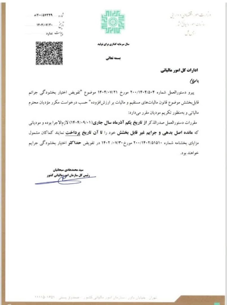 تاریخ اجرای تفویض اختیار بخشودگی جرائم قابلبخشش مالیاتی تا یکم آذرماه ۱۴۰۴تمدید شد