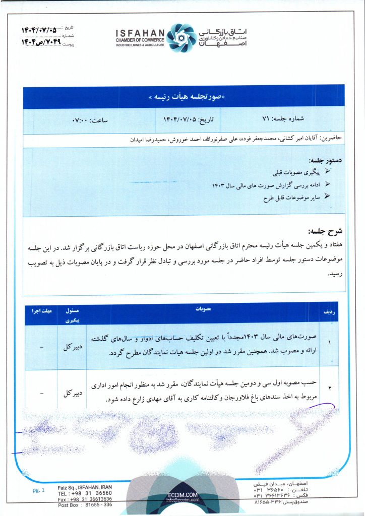 صورتجلسه و مصوبات جلسه مورخ 1404/07/05هیأت رئیسه اتاق بازرگانی، صنایع، معادن و کشاورزی اصفهان در راستای شفافیت عملکرد اتاق دهم جهت بازدید اعضاء محترم انتشار یافت.