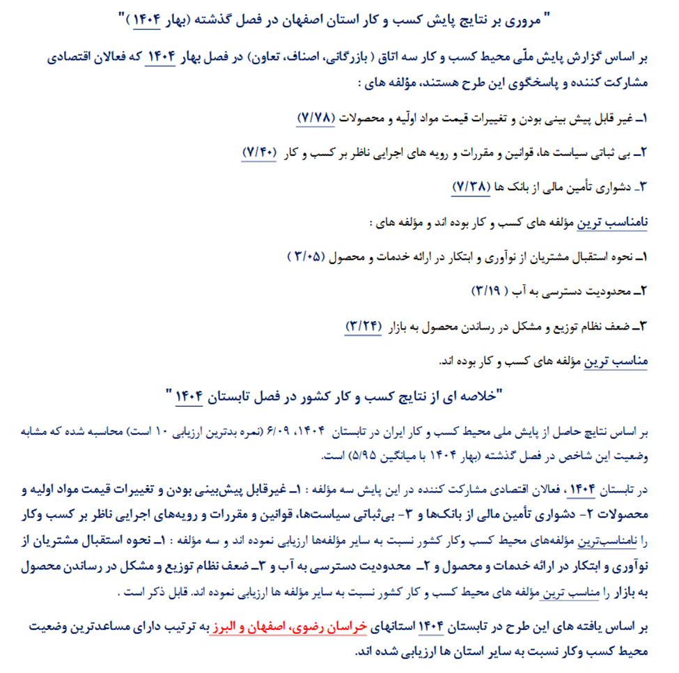 گزارش پایش ملی محیط کسب وکار ایران – تابستان1404 ، اصفهان در رتبه دوم استان های کشور از نظر محیط کسب و کار