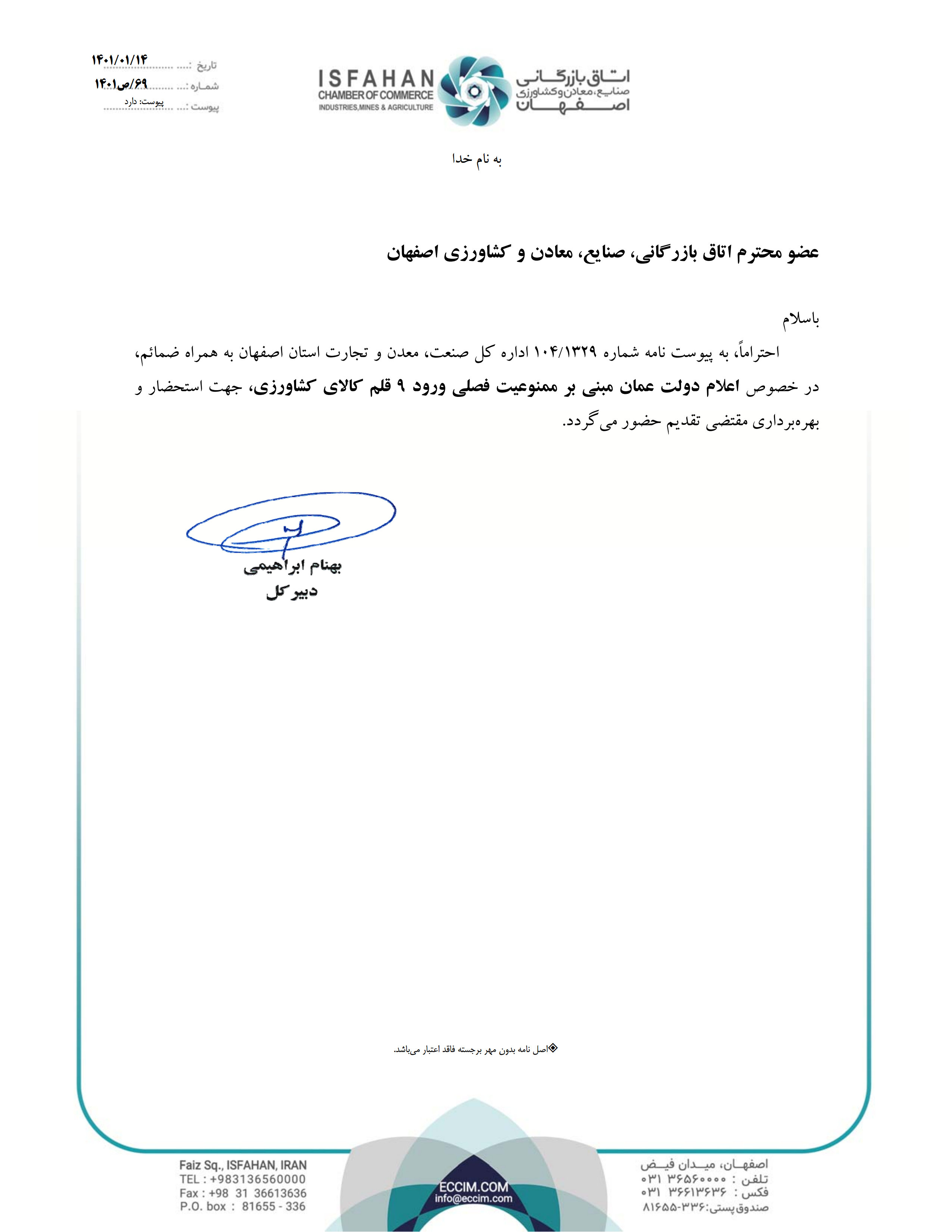 اعلام دولت عمان مبنی بر ممنوعیت فصلی ورود 9 قلم کالای کشاورزی
