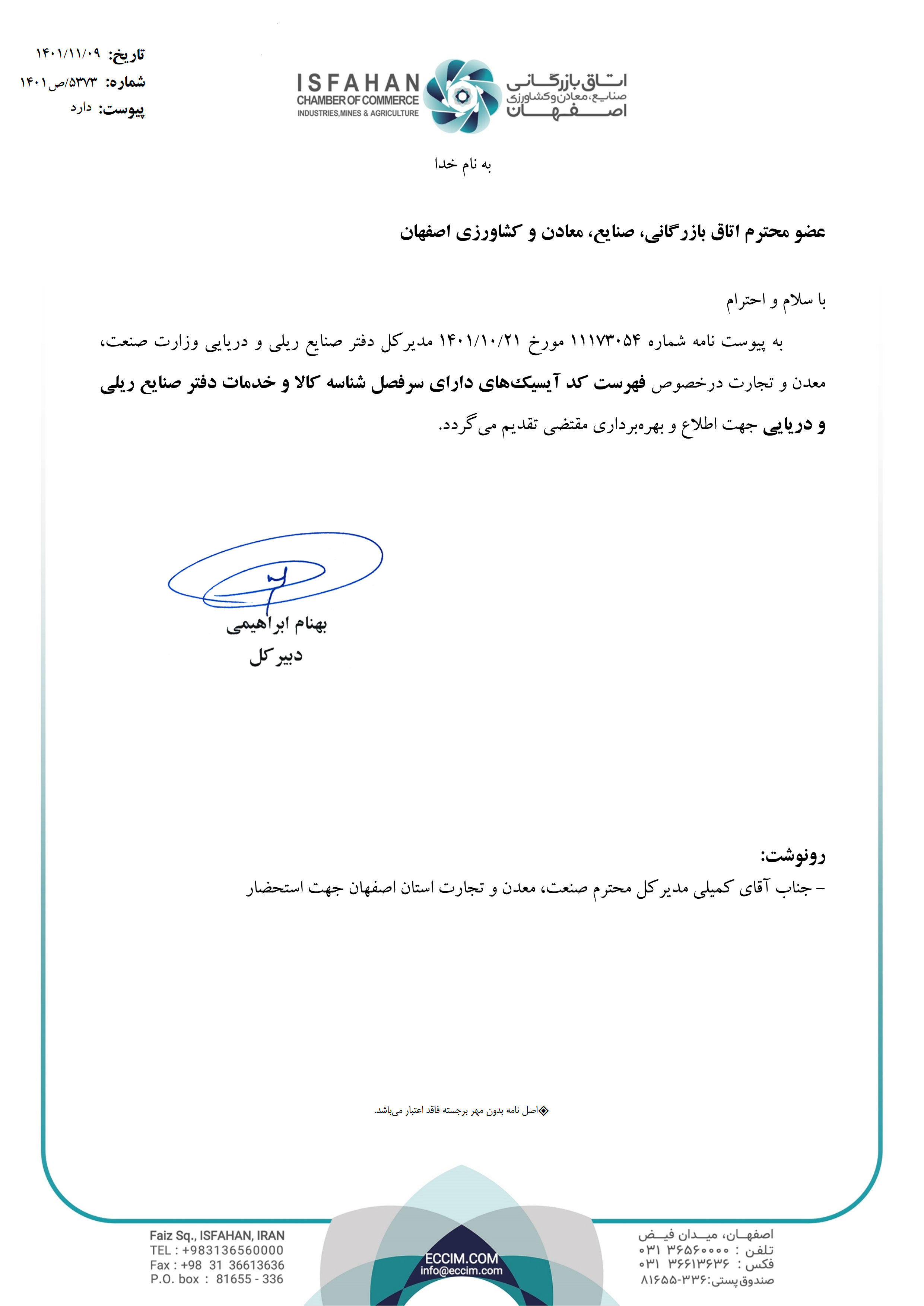 فهرست کد آیسیک‌ های دارای سرفصل شناسه کالا و خدمات دفتر صنایع ریلی و دریایی